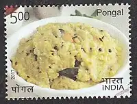 Pongal (lit. 'to boil over') is a South Indian and Sri Lankan dish of rice cooked in boiling milk.[1][2] Its preparation is the main custom associated with the Pongal festival. It is also eaten as a breakfast food.[3] A part of Tamil cuisine, varieties include venn (hot) pongal, sakkarai (sweet) pongal, kozhi (chicken) pongal, and sanyasi pongal. It has been described as "very dear to (the) Tamil people."[2]