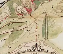 With the collapse of the Saint-Bénézet bridge the Rhône at Avignon was crossed by ferry until the beginning of the 19th century. Between 1806 and 1818 a wooden bridge was built across the two branches of the river, a few hundred metres south of the old bridge at the Porte de l'Oulle.[20][21] The section across the Avignon branch of the Rhône was replaced by a suspension bridge in 1843. This was demolished in 1960 with the opening of the Edouard Daladier bridge.[22] The section of the wooden bridge across the Villeneuve branch of the Rhône was not replaced until 1909. The replacement stone bridge, the Nouveau Pont, was damaged by bombing in 1944 during World War II. It was repaired after the war but was replaced by the Pont du Royaume in 1972.[23]