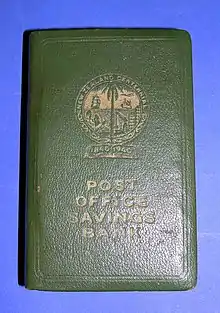 The Post Office Savings Bank was set up in 1867 to encourage thrift by ordinary people, and was immediately successful.[1] One of the benefits of the Post Office Savings Bank was that customers could deposit and withdraw money at any branch of the bank.[2] Business was conducted from post offices which were located in towns and cities all over New Zealand. By the 1910s customers were asking for the ability to withdraw their funds by cheque but successive postmasters-general refused to allow this, stating that the Post Office Savings Bank was not the same as a commercial bank, having as its objective thrift and regular deposits, not convenience.[3][4][5] This had the effect of making it easy to deposit money but harder to withdraw it.[6] However the bank eventually moved with the times and cheques were introduced in 1958.[7] During its long history the Post Office Savings Bank introduced various other products including school banking (the 'Squirrel' savings accounts) and Bonus Bonds.