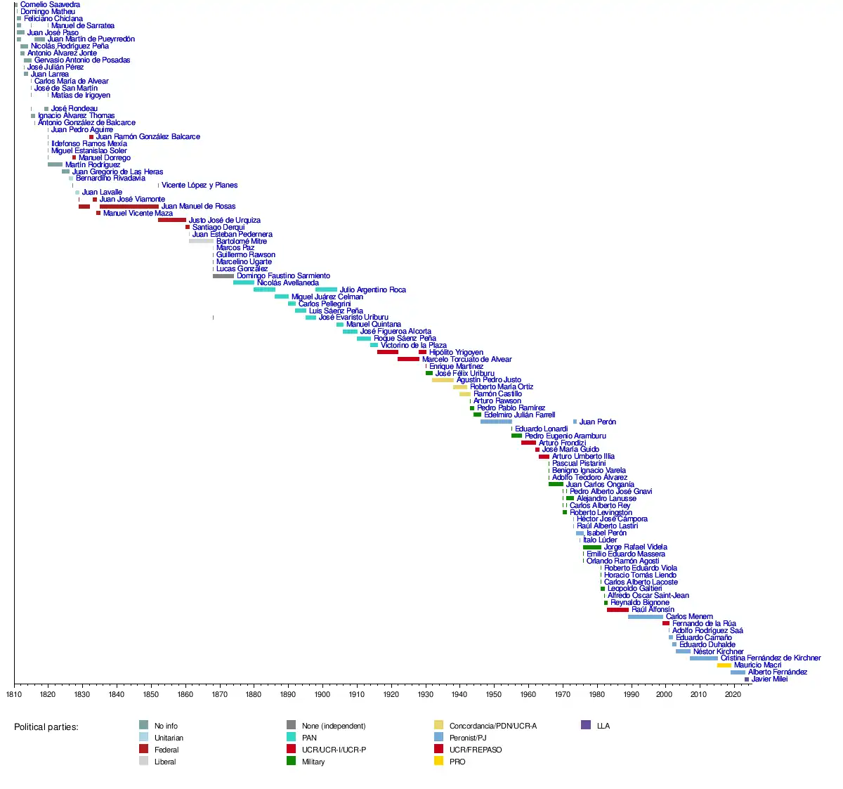 The succession line of constitutional presidents run uninterrupted until 1930, when José Félix Uriburu took government through a civic-military coup d'état. For many decades, there was an alternance between legitimate presidents and others that took government through illegitimate means. Those means included coups d'état, but also proscriptions of major political parties[6] and electoral fraud.[6][7] The last coup d'état occurred in 1976 and resulted in the National Reorganization Process, which ended in 1983. The retrospective recognition as presidents or heads of state of any de facto ruler that exercised its authority outside the Constitutional mandate is a controversial and relevant issue in Argentine politics.[8][9][10] However, their government actions were recognized as valid following the de facto government doctrine that used to legitimize them.[11] This doctrine was rejected by the 1994 amendment and would not be applicable for potential future coups. The current head of state is President Javier Milei, who took office on 10 December 2023.