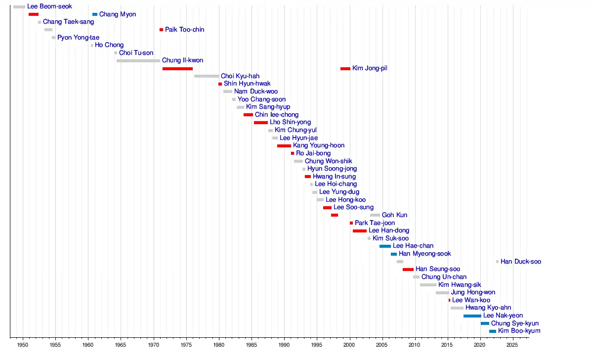 31 July 1948 | 20 April 1950 | 1 year, 263 days | Independent | ![]() Rhee Syng-man |