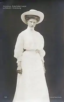Princess Adelaide Louise of Schleswig-Holstein-Sonderburg-Glücksburg (German: Adelheid Luise; 19 October 1889 11 June 1964) was a daughter of Friedrich Ferdinand, Duke of Schleswig-Holstein and his wife Princess Karoline Mathilde of Schleswig-Holstein-Sonderburg-Augustenburg.[1]