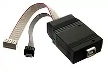 Usually device programmers are connected to a personal computer through a parallel port,[1]:364 USB port,[11] or LAN interface.[12] A software program on the computer then transfers the data to the programmer,[1]:364 [13]:430 selects the device and interface type, and starts the programming process to read/ write/ erase/ blank the data inside the device.[14][15]
