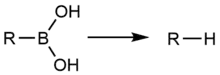 Protodeboronation, or protodeborylation is a chemical reaction involving the protonolysis of a boronic acid (or other organoborane compound) in which a carbon-boron bond is broken and replaced with a carbon-hydrogen bond. Protodeboronation is a well-known undesired side reaction, and frequently associated with metal-catalysed coupling reactions that utilise boronic acids (see Suzuki reaction).[1] For a given boronic acid, the propensity to undergo protodeboronation is highly variable and dependent on various factors, such as the reaction conditions employed and the organic substituent of the boronic acid.