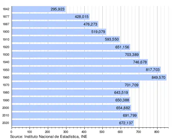 The population in the province of Badajoz has been characterized by a constant growth until the 1960s, when a strong exodus towards more prosperous areas of the country began, mainly Catalonia and Madrid, reducing the population by almost 200 000 inhabitants in a matter of 20 years. Since the 1980s the population has stagnated below 700 000, with a slight growth until 2010, when the trend is again reversed and the province loses population again. If we observe the trend by municipalities, we can see how the municipalities located in the mountains to the east and south of the province are constantly losing population while those located near the population centres of Badajoz, Mérida, Don Benito or Almendralejo are growing.[3]