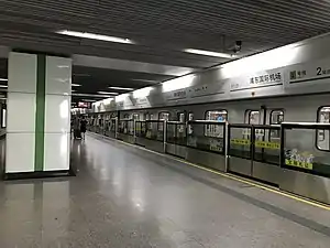 Pudong International Airport (simplified Chinese: 浦东国际机场; traditional Chinese: 浦東國際機場; pinyin: Pǔdōng Guójìjīchǎng) is a metro and maglev station located within Shanghai Pudong International Airport in Shanghai.[1] It serves as both the eastern terminus of both the Shanghai maglev train, having opened to trial operations on 31 December 2002,[2] and, since an eastern extension from Guanglan Road opened on 8 April 2010,[3][4] the eastern terminus of Line 2 of the Shanghai Metro. Although the metro and maglev stations are in the same property, they have distinct fare-paid zones, as their fare systems are separate.
