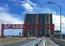 In 2012, in response to the lack of adequate bicycle facilities currently on the Pulaski Bridge, the NYC Department of Transportation began studying the possibility of installing dedicated bicycle lanes on the bridge.[8] Since the Pulaski is a drawbridge with an open section in the middle, it presents several challenges not faced by other bridges. First, physical dividers must be lightweight yet securely installed so they don't come loose when the drawbridge is opened. Secondly, the joints where the two leaves come together must be somehow protected to make them more bicycle wheel-friendly. In April 2013, in a letter to Assembly Member Joe Lentol, the NYC Department of Transportation Commissioner stated that the proposal for a two-way dedicated bike lane, which would convert the existing walkway to a pedestrian-only path, had met the requirements of a traffic analysis and that an engineering study and recommendations would be made by the end of the year.[9] On October 25, 2013, Lentol announced that the DOT was in the process of designing a dedicated bike lane and that the final design would be presented to community board 1 in Brooklyn and Community Board 2 in Queens before the end of the year. Bike lane construction was originally projected to occur late spring or early summer of 2014.[10] Construction occurred during the winter of 2015 and the bike lane opened at the end of April 2016.[11]