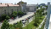 The northwestern side of the area includes a park and building complex, partially built on the site of two former cemeteries.[1] Near the park's central fountain is a monument, erected in 2002 to commemorate this history. Nearby stands a statue entitled Hirošima, a gift from sculptor Tibor Bártfay,[2] at the former site of a Soviet statue of a militiaman dating to 1972[3] commemorating the Red Army's victory over Nazi Germany.[4]