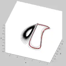 An example of chaotic behaviour is obtained for γ = 0.87 and α = 1.1 with initial conditions of (−1, 0, 0.5),[4] see trajectory on the right. The correlation dimension was found to be 2.19 ± 0.01.[5] The Lyapunov exponents, λ are approximately 0.1981, 0, −0.6581 and the Kaplan–Yorke dimension, DKY ≈ 2.3010[4]
