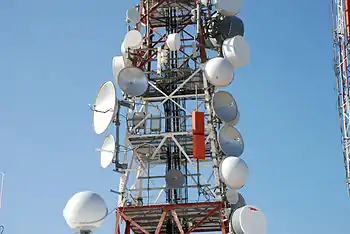 - Cell phone – a portable wireless telephone that is connected to the telephone network by radio signals exchanged with a local antenna at a cellular base station (cell tower).[87] The service area covered by the provider is divided into small geographical areas called "cells", each served by a separate base station antenna and multichannel transceiver. All the cell phones in a cell communicate with this antenna on separate frequency channels, assigned from a common pool of frequencies. The purpose of cellular organization is to conserve radio bandwidth by frequency reuse. Low power transmitters are used so the radio waves used in a cell do not travel far beyond the cell, allowing the same frequencies to be reused in geographically separated cells. When a user carrying a cellphone crosses from one cell to another, his phone is automatically "handed off" seamlessly to the new antenna and assigned new frequencies. Cellphones have a highly automated full duplex digital transceiver using OFDM modulation using two digital radio channels, each carrying one direction of the bidirectional conversation, as well as a control channel that handles dialing calls and "handing off" the phone to another cell tower. Older 2G, 3G, and 4G networks use frequencies in the UHF and low microwave range, between 700 MHz and 3 GHz. The cell phone transmitter adjusts its power output to use the minimum power necessary to communicate with the cell tower; 0.6 W when near the tower, up to 3 W when farther away. Cell tower channel transmitter power is 50 W. Current generation phones, called smartphones, have many functions besides making telephone calls, and therefore have several other radio transmitters and receivers that connect them with other networks: usually a Wi-Fi modem, a Bluetooth modem, and a GPS receiver.[88][89][90]