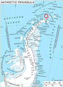 Location of Astrolabe Island in the Antarctic Peninsula region.