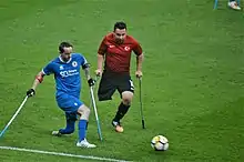 Rahmi Özcan (red/black) playing for Turkey in the 2017 European Amputee Football Championship final match against England.