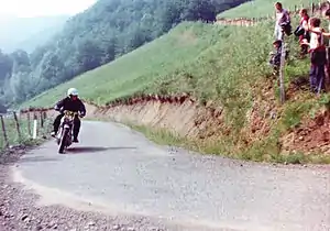 The Rallye des Pyrénées, also known as the Circuit des Pyrénées and formerly as the Pau-San Sebastián Rally,[1] was a two-day international motorcycle competition in late June set in the Pyrenees mountains of France and Spain, consisting of about 400 miles (640 km) of timed trials and hill-climbs.[2] The competition, started in 1951 by the Union Motorcycliste Paloise,[3] attracted a high proportion of competitors from European police and military units.[1] French motorcycle periodical, Moto Revue, stated, "The Circuit des Pyrénées confronts the riders with many hazards and to cross the finish line is itself a fine reward",[4] whilst motorcycle writer Cook Neilson described the competition as "the ultimate remaining Racer Road experience".[3] British magazine, Motor Cycle Sport called the 1978 event, "an anachronism and dangerous" yet "one of those phenomenal events that should not really be allowed but is".[5]