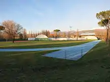 Behind the main track is an area reserved to training and warming up, with a 250-metres-long 6-lane track, an area equipped for the long jump and javelin, and a marquee with an heated indoor track for winter trainings.