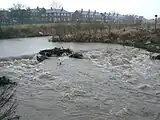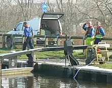 The River Ribble and the Savick Brook Ribble Link are subject to outfall from a number of sources, including the Springfields nuclear fuel production facility at Salwick, to the north of Savick Bridge. A research project by the University of Portsmouth was carried out to test low cost tools for measuring water quality, with one of the pilot studies carried out on the Ribble. This was known to have failed to meet Environmental Quality Standards, due to the presence of heavy metals, organic compounds and organo-metallic compounds. The Environment Agency take samples from the estuary once a month to monitor the water quality, but the research project took samples from many more monitoring points including on the Ribble Link.[66] Research carried out in 2006 looked at the effects of radioactive discharges from the Springfields site on those working, living or finding recreation in the locality. The site produced fuel for Magnox reactors, pressurised water reactors and advanced gas-cooled reactors at the time of the survey, although the production of Maxnox fuel ceased in 2007. Radionuclides are discharged to the air and in liquids into the environment, with levels of radionuclides dropping significantly since Maxnox fuel production stopped. At the time the site was owned by the Nuclear Decommissioning Authority, and operated by Springfield Fuels Ltd Westinghouse.[67] The Ribble Link between the sea lock and lock 8 was studied as part of the aquatic survey.[68] Sediments dredged from this section during construction were used to landscape the north-west bank of the brook, and these were tested for beta emissions.[69] The report recommended that testing for beta and gamma dose rates could be introduced on the section of the Ribble Link below the sea lock, where beta dose rates were found to be relatively high.[70]