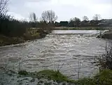 While the locks were being constructed, the channel was widened, and in some places sharp bends were eased to ensure that boats could negotiate the turns.[29] Lock 6 had to be built on the line of the Brook, and so a bywash was created, to enable the brook to continue to flow while the work was carried out.[30] Lock 7 was built close to a new footbridge which had been built by the Waterway Recovery Group some years previously.[31] The most difficult lock to build was Lock 8, as the site was affected by tides, which flooded the works of several occasions. Spoil removed from the lock site and the adjacent channel was spread on land nearby, whereas spoil from most of the excavations was removed by lorry to wasteland close to Preston Docks.[32] Upsteam of the lock, a farm bridge was replaced with a new structure, imported from Italy. The corrugated steel panels were bolted together and the structure was then craned into position.[33] Prolonged heavy rain in late August resulted in extensive flooding, causing significant damage to the newly built banks, which were washed into the channel. A second flood occurred in mid-September, and a third on 8 October, all of which resulted in work having to be re-done.[5]