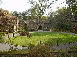 Ridley Creek State Park is a 2,606-acre (1,055 ha) Pennsylvania state park in Edgmont, Middletown,[3] and Upper Providence Townships, Delaware County, Pennsylvania in the United States. The park, about 5 miles (8 km) north of the county seat of Media, offers many recreational activities, such as hiking, biking, fishing, and picnicking. Ridley Creek passes through the park. Highlights include a 5-mile (8 km) paved multi-use trail, a formal garden designed by the Olmsted Brothers, and Colonial Pennsylvania Plantation, which recreates daily life on a pre-Revolutionary farm. The park is adjacent to the John J. Tyler Arboretum. Ridley Creek State Park is just over 16 miles (26 km) from downtown, Philadelphia between Pennsylvania Route 352 and Pennsylvania Route 252 on Gradyville Road.