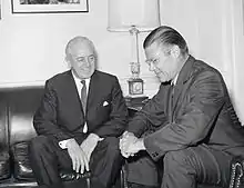 Unable to gain a consensus about what to do, in September 1963, Kennedy sent McNamara and General Taylor on a "fact-finding mission" to South Vietnam.[68] At a meeting in the Gia Long Palace, President Diệm showed McNamara various graphs and charts that purported to be proof that the war was being won. This performance convinced McNamara the war was as good as won.[69] Kennedy wanted a negative assessment of Diệm to justify supporting a coup, but McNamara and Taylor instead wrote about the "great progress" achieved by Diệm and confidently predicted that the "bulk" of the American advisers would leave in 1965 as by that point they predicted that the VC insurgency would be crushed.[70] McNamara predicted that if Diệm continued his policies, that by 1965 the insurgency would be "little more than organized banditry".[71] With the CIA and the ambassador Henry Cabot Lodge Jr. urging support for a coup while the Pentagon was opposed, Kennedy vacillated but ultimately gave the power of decision to Lodge.[72] Lodge, who detested Diệm, gave his approval to the generals plotting against him.[73]