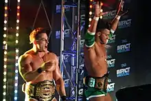 Robbie E with Jessie Godderz (left), as the TNA World Tag Team Champions in April 2014