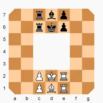The board comprises 7×7 squares with the central 3×3 section missing. Pieces generally move clockwise around the board. Each player starts with one king, one bishop, two rooks, and two pawns. Both bishops are light-squared on the initial setup. Dark-squared bishops can only be obtained by pawn promotion.