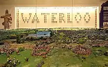 The exhibition, entitled “With the Rifles to Waterloo”, opened in 2015 to commemorate the 200th anniversary of the Battle of Waterloo, is focused on the Napoleonic Wars. Interactive displays and weapon handling exhibits cover the creation in 1800 of the Experimental Corps of Riflemen (later the 95th or Rifle Brigade), and the story of the Light Division commanded by Sir John Moore in the Peninsular War. Set against a display of original campaign medals from the period,[lower-alpha 2] spelling out ‘WATERLOO’ the centrepiece of the exhibition is a 25 square metre diorama of the Waterloo battlefield on which 30,000 model soldiers and horses, with an accompanying sound and light commentary, depict the fighting on 18 June 1815.[3] Other visitor attractions include the Early Years Section covering the raising in 1755 of The Royal American Regiment in North America, the Siege of Quebec and the Indian Mutiny.[4] The Victoria Cross display “For Valour” describes the personal histories of each of the regiments’ 59 soldiers who were awarded the Victoria Cross.[5]