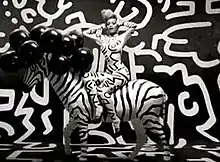 Rihanna is shown wearing a skin tight black and white catsuit, sitting on a stuffed zebra, with a black and white background. The scene from the video draws influence from paintings by the 1980s pop culture artist Keith Haring, who was famous for using graffiti patterns in his artwork.[52][53]