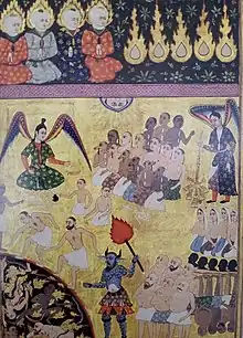 It is mentioned in the Quran, and is described in the Hadith.[2] As-Sirāt is said to be thinner than a strand of hair and as sharp as the sharpest knife or sword (because of its danger).[3] Below this path are the fires of Hell, which burn the sinners to make them fall. Those who performed acts of goodness in their lives are transported across the path in speeds according to their deeds leading them to the Hawd al-Kawthar (lit. 'Pond of Abundance').[4][5][6]