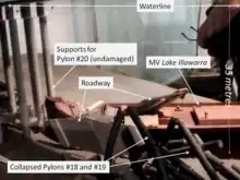 The collision brought down the two support pylons and a 127-metre (417 ft) section of steel and concrete.[3] There was evening traffic on the bridge, and although no vehicles were on the section that fell, four cars drove off the gap, with five people killed.[3] Two cars stopped on the edge, their occupants able to escape.[3] The section of four-lane highway landed on the ship's deck, sinking her in 35 metres (115 ft) of water to the south of the bridge. Seven of the ship's crew died in the accident.[1][3]