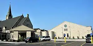 Bracke-Hayes-Miller-Mahon Architects (BHMM) of Davenport began working with the parish in 2012 to develop a plan to update the parish facilities. A new handicap-accessible entrance on the east side of the cathedral was completed in January 2013. In September 2016 construction began on the new hall immediately behind the cathedral. It includes a gathering space, restrooms, a handicap-accessible entrance on the west side, a reception hall, and classrooms.[28] Mark Miller was the principal architect and Swanson Construction of Bettendorf was the contractor. The hall was dedicated by Bishop Thomas Zinkula on November 19, 2017. It was named for parishioners Weir and Pat Sears who gave the first $1 million for the $7 million project.[29] The gathering space was named in honor of Antoine and Marguerite LeClaire. A new parking lot completed the project.