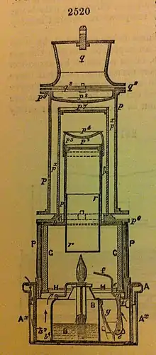 The Clifford also has a double shield, but with a plain flat top. The chimney is quite narrow with wire gauze covering the top. The bottom of the chimney has a glass bell covering the flame. The chimney is supported on a gauze shelf. Air enters through the lower part of the outer shield, through the passage and into the lamp through the inner shield. It is drawn down through the gauze, then passes the flame and ascends the chimney. At the top it leaves through gauze and the top of the double shield. The inner chimney is made of copper coated with a fusible metal: if the lamp gets too hot the metal melts and closes the air holes, extinguishing the lamp.[55]