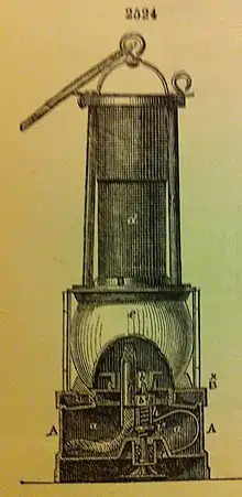 The first safety lamp made by William Reid Clanny used a pair of bellows to pump air through water to a candle burning in a metal case with a glass window. Exhaust gases passed out through water. The lamp was intrinsically safe provided it was kept upright, but gave out only a weak light. It was heavy and ungainly and required a man to pump it continuously. It was not a practical success, and Clanny subsequently changed the basis of operation of later lamps in the light of the Davy and Stephenson lamps.[11]
