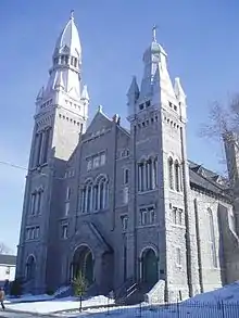 Discussions to establish a distinct anglophone parish and church for Lower Town began in March 1888. A committee of parishioners from Notre-Dame Cathedral held meetings with the Archbishop of Ottawa, the Most Rev. Joseph-Thomas Duhamel. It was agreed to create a new parish; a site for the church chosen; and by May 3, 1888, James R. Bowes had been chosen as architect. The plans called for a substantial structure at the corner of St Patrick and Cumberland Streets.[1] Built in the Romanesque Revival style (generally called Norman at that time), the principal façade has three heavy round headed portals and paired towers of unequal height and detail. The taller (eastern) tower is capped with a stylized bishop's mitre placing the church and its Irish parishioners squarely in the Ultramontanist tradition of the Catholic Church. Work began on St Brigid's in 1889 and the Blessing of the completed Church took place on August 3, 1890.