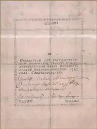 In 1769, during the reign of Catherine the Great, the Russian Assignation Bank was founded in St. Petersburg to issue and exchange banknotes in the denomination of 25, 50, 75 and 100 rubles. These notes, known as Assignation rubles, were based on the copper money then circulating in the country. In 1786, the Moscow and St. Petersburg branches merged to form the "Imperial Assignation Bank", which was allowed to perform currency exchange operations with foreign states.