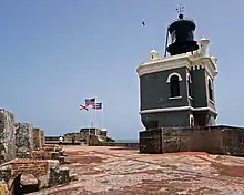 Castillo San Felipe del Morro is the most famous and most visited structure of the San Juan National Historic Site.[11] This citadel is located at the northwesternmost tip of the Islet of San Juan built onto a promontory (morro in Spanish) which gives it its nickname of El Morro. Named after King Philip II of Spain, it was built at the site of a former smaller fortress between the 16th and 18th centuries to protect the entrance to the Bay of San Juan and to defend the city from maritime attacks.[14] El Morro Esplanade is a large open area located between El Morro and Ballajá which serves as the main recreational space of the historic site as it offers panoramic views of the bay and is very popular for activities such as picnics, stargazing[15] and kite flying.[16] Additionally, Paseo del Morro is a paved trailway which connects the lower walls of El Morro with the San Juan Gate (Puerta de San Juan), formerly known as the Water Gate (Puerta de Agua), and it offers panoramic views of the San Juan Bay and access to the best preserved section of the city walls and its famous sentry boxes (garitas).[17]