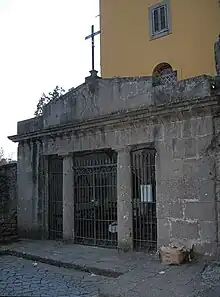 When the veneration of the image first began, it must have been located in an open-air roadside aedicula along the then public road leading to Castel Gandolfo and Albano Laziale, corresponding to today's Via Antonio Fratti.[9] The image was connected to the built-up area by a staircase of thirty-four steps carved into the peperino stone, which allowed the visitor to avoid the steep bend in the road and which is still visible today at the back of the sanctuary.[9] The veneration of the image is also linked to a miraculous event reported by popular tradition: it is said that a man, while riding his horse on the Via Maremmana Inferiore in the direction of Castel Gandolfo and Albano Laziale, lost control of the animal in the hairpin bends of the road and was in danger of falling into the precipice had not Our Lady intervened to save him.[10] In the following centuries, other miracles were attributed to the Virgin of Acquasanta: in August 1883, the high prelate Pietro Rota,[11] archbishop of Carthage and canon regular of the St. Peter's Basilica in Rome, made an ex voto to Mary to thank her for saving him from a ruinous fall from a horse in the precipitous paths on Lake Albano;[12] and so many other episodes,[12] even quite serious ones.
