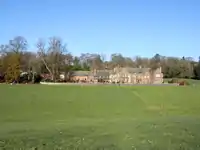 Francis Hall (d.1728) of West Sandford, Crediton, married Frances Quicke, daughter of Andrew Quicke (1666-1736) of Newton St. Cyres, Devon. A monument to Francis Hall (d.1728) exists in Newton St Cyres Church.[14] She married secondly Sir John Chichester, 4th Baronet (1689-1740), of Youlston Park,[15][16][17] to whose family the estate of West Sandford appears to have descended. West Sandford was a very large mansion about 2 1/2 miles NW of Crediton, near the ancient Chichester estate of Ruxford, of which a watercolour painting was made in 1797 by the Devon topographer Rev. John Swete. The latter wrote of West Sandford in his Travel Journal in 1797 as follows: "The appearance of this house, built with brick and decorated with white mouldings, is of great respectability. Its contiguous gardens with high walls and large gates and the groves that shelter it on the NE speak it to have been the residence of some person of consequence who had a relish for things of former days and was too advanced in years to adopt the improvements of modern taste. It was long the property and abode of Lady Chichester and by her decease a few years ago became a possession of Sir John Chichester of Youlston, Bart. Beheld in its two fronts from a rising point of the public road it had such extent of building as to possess a degree of magnificence; nor has it less to recommend itself for its situation, having spread out before its windows some of the richest pasture ground in the county. What ingredients of the picturesque, taking advantage of the road as a foreground, may enter into the composition of the scenery, may be collected from the following sketch".[18] This large house had already been demolished by 1822 as reported by Lysons, who stated the estate was then owned by John Quicke, Esq.[19] The memory of this house has faded, no mention of its former existence having been made by Pevsner or Hoskins, the leading modern authorities on such matters.