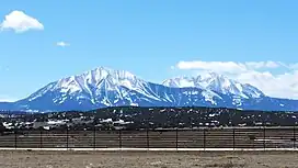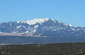 The Spanish Peaks are a pair of mountains, West Spanish Peak, 13,626 ft (4,153 m), and East Spanish Peak, 12,860 ft (3,920 m), located in southwestern Huerfano County, Colorado.[3] The Spanish Peaks were designated a National Natural Landmark in 1976 as one of the best known examples of igneous dikes.[4] The mountains can be seen from as far as 133 mi (214 km) to the north from Colorado Springs, 65 mi (105 km) to the south from Raton, New Mexico, and 85 mi (137 km) to the east from La Junta, Colorado.