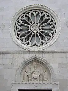 The church, dedicated to Saints John and Paul, was built on the remains of a previous sacred building with three apses and was consecrated by the Bishop of Trieste Arlongo dei Visgoni on 29 December 1263.[2] The Romanesque building was augmented, in the middle of the 15th century, by the cladding of the facade in white stone slabs, an example of Gothic-Venetian style.[3] The church underwent a total remodeling between 1444 and 1467.[4] In 1865 the facade, lying off-axis, was rebuilt from the rose window upwards and lowered by half a metre. The choir was lengthened in 1873 and a new high altar was consecrated in 1877.[5]