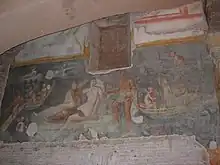 In one room, which was a nymphaeum courtyard, an elegant third-century AD fresco depicting Proserpine and other divinities among cherubs in a boat (3 m × 5 m (9.8 ft × 16.4 ft)) can be found, as can traces of another marine fresco and mosaics in the window arches. Between the third and the fourth century AD, some modifications were made to the rooms, and a sort of oratory was made, with Christian-themed frescoes, while in the other rooms the decorations did not specifically have Christian themes (winged genies, garlands, birds, etc.). A confessio was also built in the fourth century AD in a passageway behind the Clivus Scauri. The walls of the confessio were frescoed with Christian themes (e.g., the beheading of Saints Crispus, Crispinus, and Benedicta, female figures and an orante or "person in prayer").[3]