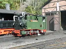 It was driven the first few meters under its own steam on 16 June 2009 in Meiningen. On 4 July 2009, the new locomotive was christened and officially put into service in the narrow-gauge area of Radebeul Ost station.[1] The new locomotive 54, which also bears the computer number 99 7528, was initially at home on the Preßnitztalbahn in Jöhstadt. On 30 August 2009, the locomotive was first used as scheduled in front of the museum trains between Jöhstadt and Steinbach. After the dissolution of the Association for the Promotion of Saxon Narrow Gauge Railways, the Saxon Narrow Gauge Railways Foundation (Stiftung Sächsische Schmalspurbahnen) has owned the locomotive since 2015 and has housed it with the Saxon-Upper Lusatian Railway Company (SOEG) from summer 2015. This does not change anything in the previous operating concept.[2]