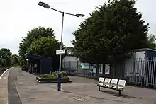 The station is on an east–west alignment, curving towards the north.[1] There is a single 140-yard (130 m)-long platform which serves trains in both directions, situated on the north side of the track.[5] The station's southern platform was abandoned in 1970 and is overgrown.[6] The station is only accessible via a footpath from the car park on Station Road, which is just off the A4 Portway.[1]