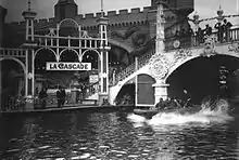 On the earliest chute rides, the flat-bottomed boat was pulled up the ramp by cable, sometimes with a turnaround on a small turntable. In the ride at Sea Lion Park, the passengers arrived at the top by elevator. The bottom of the ramp curved upwards, causing the boat to skip across the water until it came to a stop. The boat was guided to a landing by a boatman on board.[4] The oldest ride of this type still in operation is the boat chute constructed in 1926 and 1927 located at Lake Winnepesaukah Amusement Park in Rossville, Georgia, near Chattanooga, Tennessee.[5] An operating modern reproduction of the Luna Park shoot-the-chute ride of the early 20th century, The Pittsburg Plunge, is currently in operation at Kennywood amusement park in Pennsylvania.
