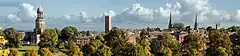 The town suffered very little from air raids in the Second World War, the worst case was in 1940, when a woman and her two grandchildren were killed when a cottage was destroyed on Ellesmere Road, the only local air raid deaths.[83] Therefore, many of its ancient buildings remain intact and there was little redevelopment in the 1960s and 1970s. However, some historic buildings were demolished to make way for the brutalist architectural style of the 1960s, though the town was saved from a new inner ring road due to its challenging geography.[84] A notable example of 1960s/70s construction in Shrewsbury was Telecom House on Smithfield Road, demolished in the 2000s.[85]