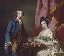 The Welby family were part of the minor landed gentry in Lincolnshire during the middle of the eighteenth century.[18] Welby himself was Lord of the Manor of Denton, near Grantham.[19] By the late 1760s, Welby had become established in high society circles, marrying the daughter of Sir John Glynne, from an old land-owning family, the Glynne baronets. The year after his marriage, he and his wife were painted by the fashionable portrait artist Francis Cotes; the painting was described as one of Cotes's masterpieces when it was sold in 2012 by the auction house Christies for £457,000.[20] The next twenty years of his life were not spent in public office, though, as a Lord of the Manor, he would have been concerned with the management of his estates. After his first wife's death in 1777, Welby remarried to an heiress, supplementing his wealth; indeed, he was able to send all of his sons from that marriage to Cambridge University.[21]