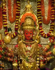 The main priest at the temple belongs to the carpenter, or Vishvakarma, caste.[5][7] Mahatma Gandhi visited Sirsi in 1934 but he refused to visit the temple, as animal sacrifice was a prevalent ancient practice at the temple; the sacrifice was in the form of offering of he-buffalo as a sacrifice to appease the goddess.[5] A he-buffalo was specially bred for offering as a sacrifice to the deity during the biennial Rathayatra. Following the protest by Gandhi, there was a social movement in the town to abolish animal sacrifice, this movement was spearheaded by Keshwain, chief trustee of the temple, in association with Vitthal Rao Hodike, a teacher and dedicated Gandhian of the town. objectives of this movement were fulfilled.[5]