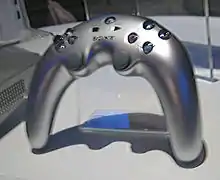 Prototype silver Sixaxis controller as shown at the E3 2006, which did not feature "Sixaxis" branding on the top