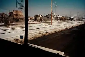 Mountains surrounding the city were also used for sniper positions, providing a safe distance and giving an excellent view of the city and its traffic.[2] Although the city was under constant Serb siege, its people still had to move about the city in order to survive, thus routinely risking their lives. Signs reading "Pazi – Snajper!" ("Watch out – Sniper!") became common. People would either run fast across the street or would wait for United Nations armored vehicles and walk behind them, using them as protective shields.[2] According to data gathered in 1995, the snipers wounded 1,030 people and killed 225 - 60 of whom were children.[3]