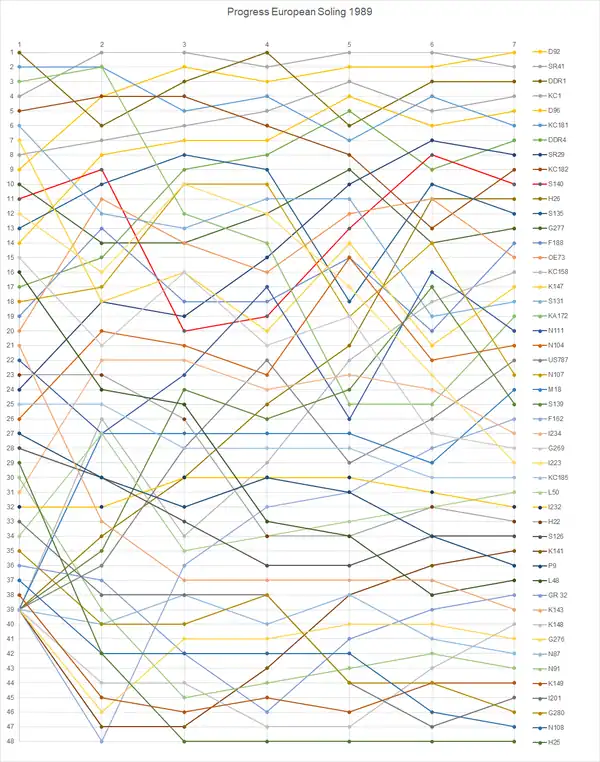 Remarkable is that the Norwegian team won this European Championship without a single race victory. The team of Jochen Schumann was in the lead until the final leg of the event. On the last moment team Terje Wang took the 8th place in the final race thus winning the event by just one point!