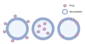 Due to their ability to oscillate with exposure to low-frequency ultrasound, microbubbles have been used as contrast agents in order to visualize tissues in which the microbubbles have permeated.[44] However, when these microspheres are exposed to higher pressure ultrasound, they can rupture, which could be beneficial for drug delivery purposes.[44] Through SDT, these microbubbles could be selectively bursted at the tumor microenvironment in order to decrease systemic levels of the encapsulated drug and increase therapeutic efficacy. When applying SDT, the increase in acoustic pressure leads to the inertial cavitation, or collapse of the microbubble and local release of the cargo within. The inertial cavitation of the microbubbles when exposed to SDT is also referred to as ultrasound mediated microbubble destruction (UMMD).[45] The shell of microbubbles can be decorated with different components, including polymers, lipids, or proteins depending on their intended purpose.[44] Microbubbles have also been used for the localized release of attached cargo. This cargo is typically chemotherapeutics, antibiotics, or genes.[12] Different drugs can be directly loaded into the microbubble with methods such as conjugation and nanoparticle, liposome loading, and genes. The combination of genes and SDT is referred to as sonotransfection.[12] Examples of outer shell modifications can be seen in a study by McEwan et al. which found that lipid microbubbles showed reduced stability when sonosensitizers were added to their shells.[44] However, attaching the polymer poly lactic-co-glycolic acid (PLGA) to the shell resulted in increased stability compared to the lipid microbubbles without losing other desirable properties such as targeted delivery and selective cytotoxicity.[44] In another study, McEwan et al. investigated the ability of microbubbles carrying oxygen to increase production of reactive oxygen species, which are a necessary component of SDT, in the hypoxic environment of many solid tumors.[46] These microbubbles were stabilized with lipids and a Rose Bengal sonosensitizer was attached to the surface to treat pancreatic cancer.[46] Their work showed that coupling oxygen-loaded microbubbles that are sensitive to ultrasound with sonosensitizing drugs could allow for increased drug activation at the desired target even if hypoxia is present. Examples of therapeutics that have been loaded into microbubbles are gemcitabine, paclitaxel nanoparticles, plasmid DNA and 2,2′-azobis[2-(2-imidazolin-2-yl)propane]dihydrochloride loaded liposomes.[47][45][48][49] Due to the targeting nature of the ligands connected to the microbubble, it allows for the controlled and specific targeting of the desired tissue for treatment. Another study performed by Nesbitt et al. has shown improved tumor reduction when gemcitabine was loaded into the microbubble and applied to a human pancreatic cancer xenograft model with SDT.[48]