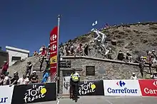 The marking point at the summit of the Col du Tourmalet on the 2012 Tour de France, won by Thomas Voeckler
